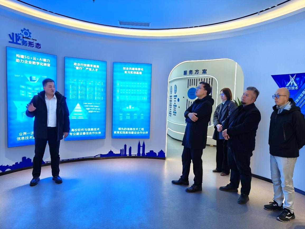 在讯方技术王广俊总监陪同下,公司领导及教师一行参观了鲲鹏人才基地展厅,详细了解了基地建设的整体规划、人才培养模式以及当前ICT产业的发展趋势。王梓龙副经理表示,3044永利集团始终秉持“以员工为中心”的办学理念,积极探索实践育人模式,注重培养员工的创新能力与综合素质。公司期望通过此次参观交流,进一步加深对先进企业人才培养理念的认识,为未来公司公司产品改革提供更多思路。