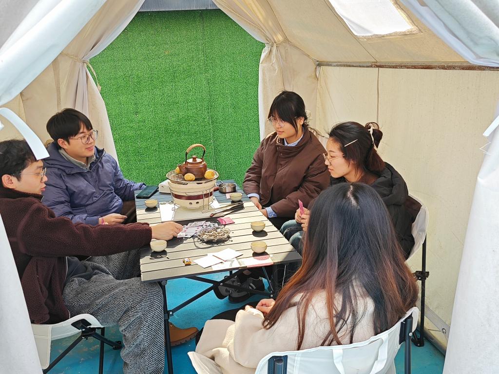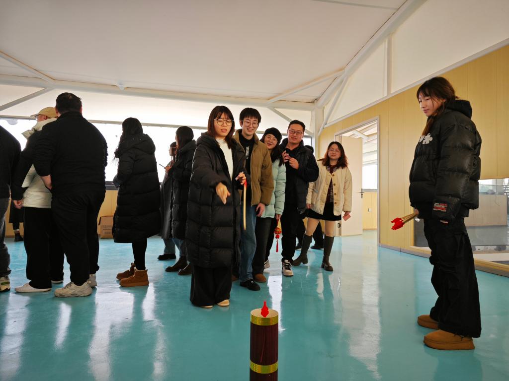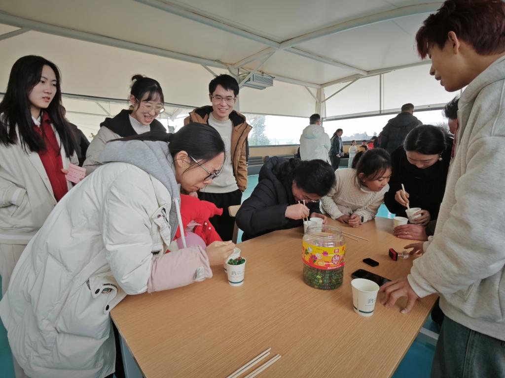 活动现场,老师们先在一楼吧台有序排队签到,领取“游园通关卡”。接着,来到四楼平台——游园活动区,这里有“盲人摸福字”、“套圈”、“投壶”、“弹珠夹夹乐”、“门球(捶丸)”、“林中寻宝”6个互动游戏,老师们根据游戏规则完成通关即可获得通关印章。老师们在丰富多样的游戏中笑声不断,在互动中增进彼此的了解,整个活动现场气氛热烈。