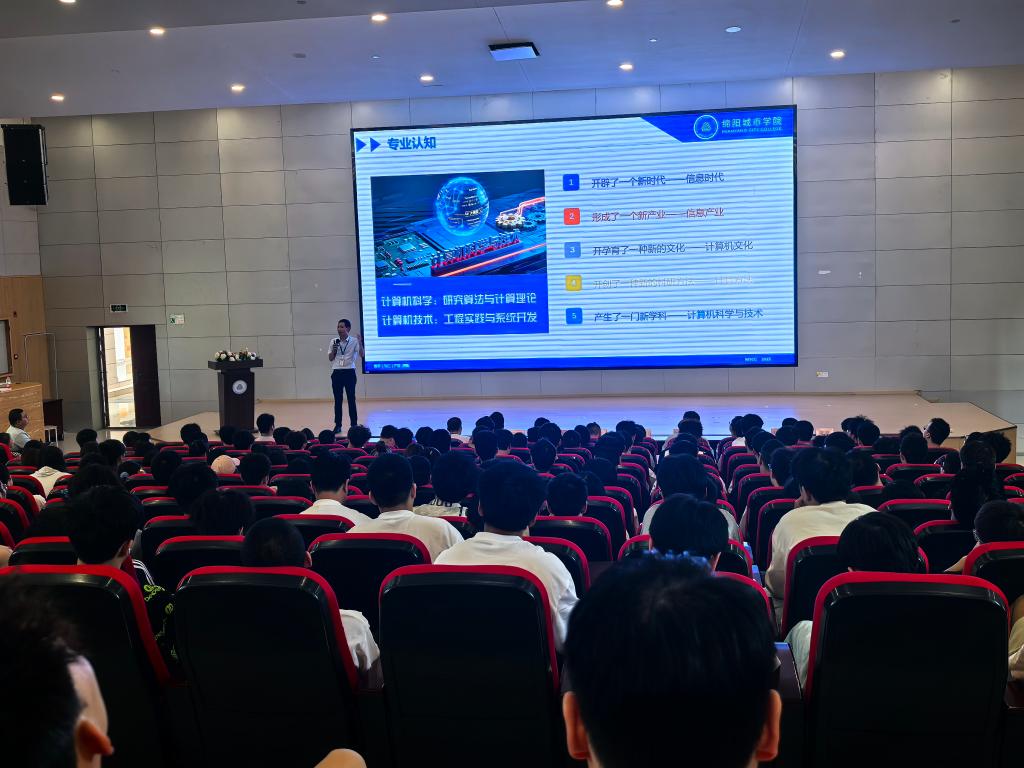 在课程体系方面,邓主任以“课程地图”的形式清晰梳理了四年的学习安排:大一夯实基础,大二深化专业,大三强化核心,大四突出实践。他还就学业成长与职业发展提出阶段性建议,鼓励同学们注重自学能力与实践锻炼,并详细说明了就业领域、典型岗位及考研、考公、考证等多向发展路径。最后,他结合云计算、大数据等新兴趋势,分析专业面临的机遇与挑战,并以“以代码为笔,算法为墨,在数字世界铸就传奇”寄语全体新生,勉励大家主动探索、持续积累。