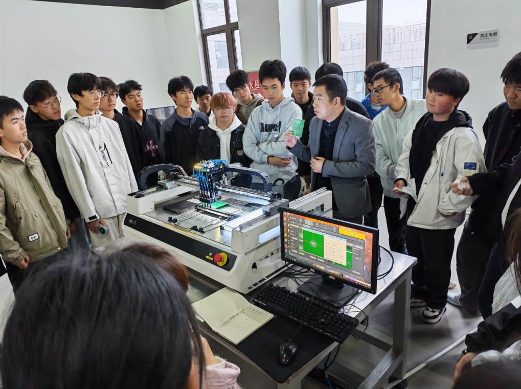 作为中国科技城(绵阳)重点高新技术企业,蝴蝶信息专注于工业自动化、智能装备研发与物联网系统集成,拥有集群网络通信系统、高速精密视觉贴片机等多项自主知识产权产品。在企业总经理王龙的带领下,师生依次走访了研发中心与生产车间,系统了解从工业设计、硬件开发到软件集成的全链条研发流程。在智能装备展示区,视觉贴片机以每分钟12000点的高速运行与0.02毫米的超高精度引发同学们阵阵惊叹。王龙指出:“技术创新必须回归实际问题。我们的贴片机通过AI算法优化,将传统设备良品率从98%提升至99.9%,这背后是数百次代码迭代与工程实验的积累。”